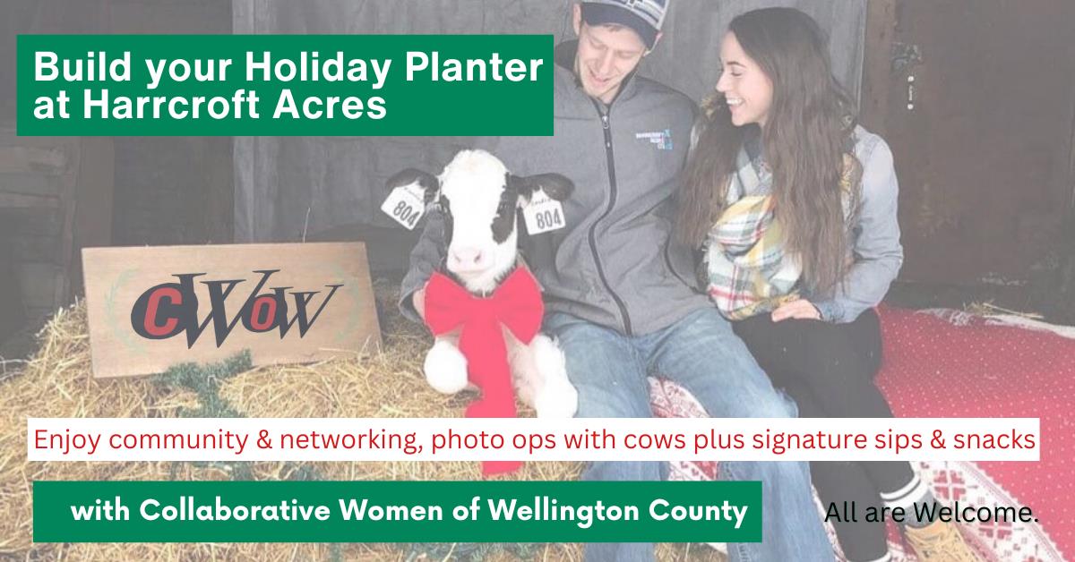 Join us for our fourth annual Holiday Planter Building event for a great opportunity to be creative, network, and have loads of fun!! Bring your planter or fill our inserts. You're invited to Harrcroft Acres Farm, where all the supplies are included with fun photo ops with cows and light refreshments too. We will be in the barn, and just for fun, we're asking you to wear warm Holiday Plaid clothing!Please bring plant snips or scissors if you have them.Hosted by Collaborative Women of Wellington (CWOW) & Harrcroft Acres. This event is open to all.November 19th – 6pmHarrcroft Acres – 7812 Sideroad 5, Fergus (may be Alma in your GPS) Register Online$50 + hst